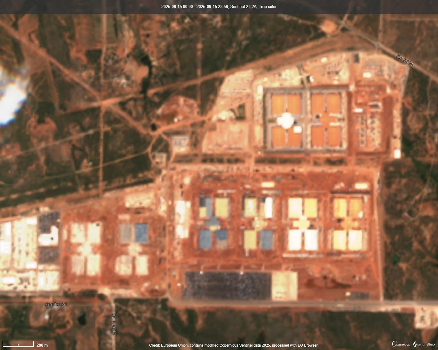 We can also see the transmission lines running north-south along the eastern perimeter and a new, expanded substation being constructed: