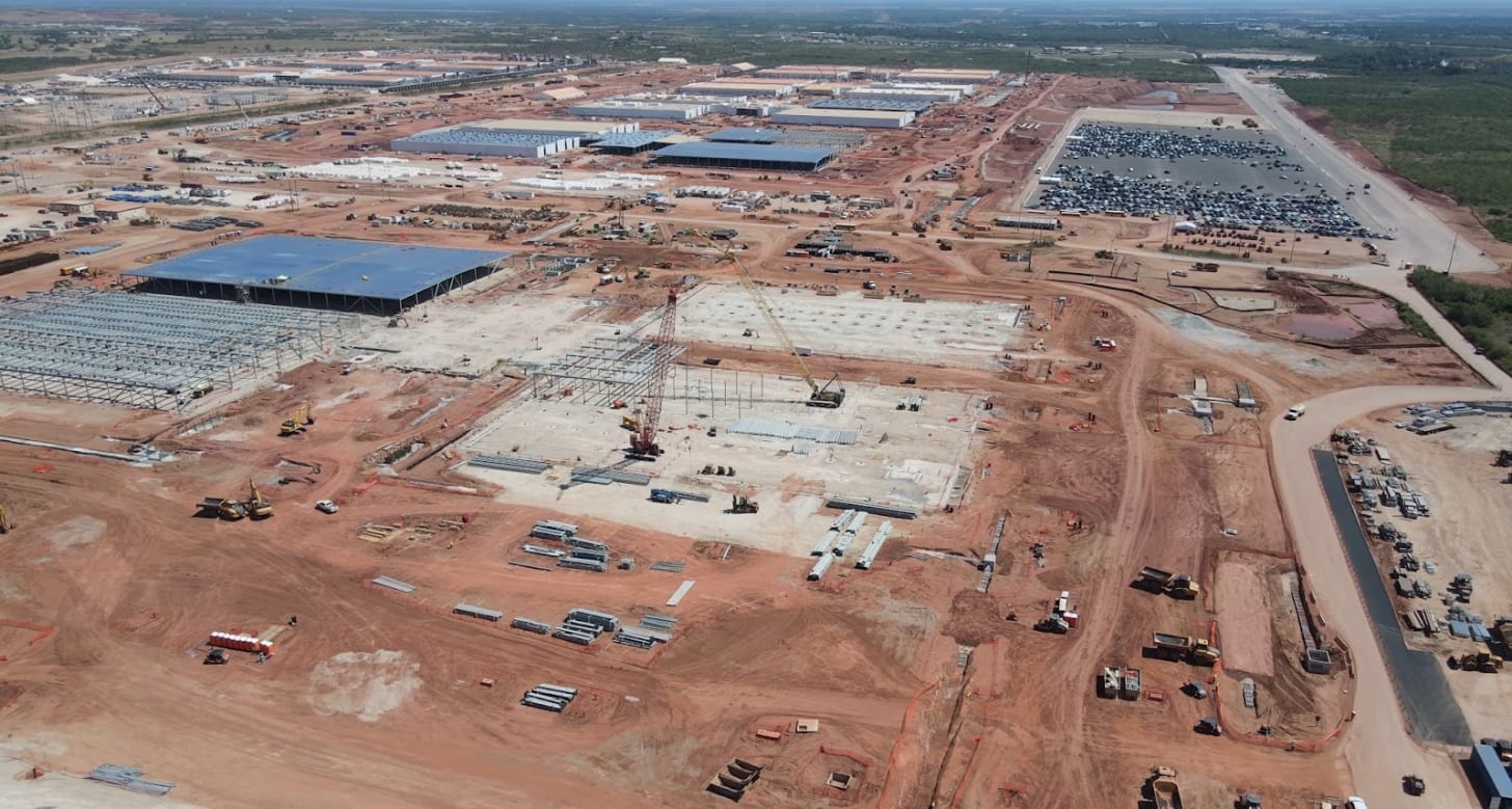 Surrounding the physical structures are civil works including roads, drainage trenches, firefighting egress, hydrants, parking, and security facilities.