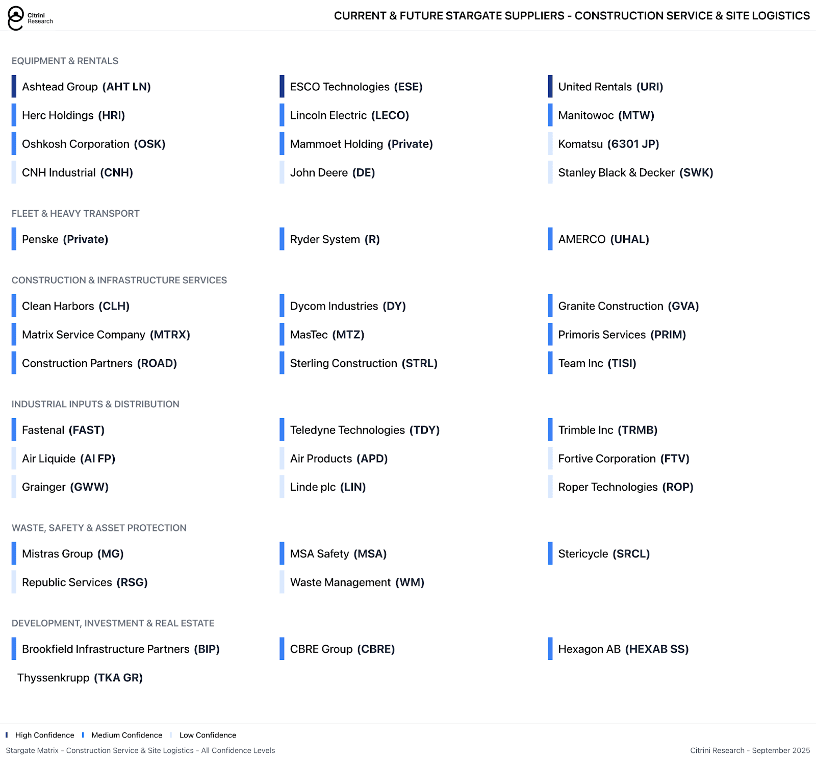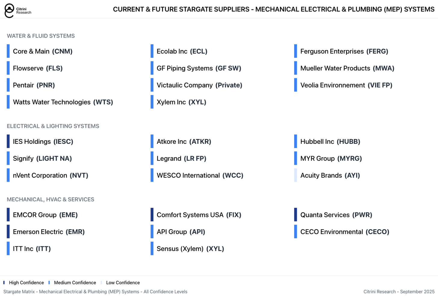 Stargate will likely rely on a range of MEP providers including the ubiquitous large-cap names with broad construction exposure throughout the economy. But even for diversified construction companies, these represent massive assignments and material revenue opportunities, which are only beginning in earnest as these mega-projects begin to break ground.
