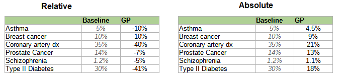 Here’s the same table for other conditions, courtesy of Genomic Prediction (except I flipped the colors from the original, to match the one above):