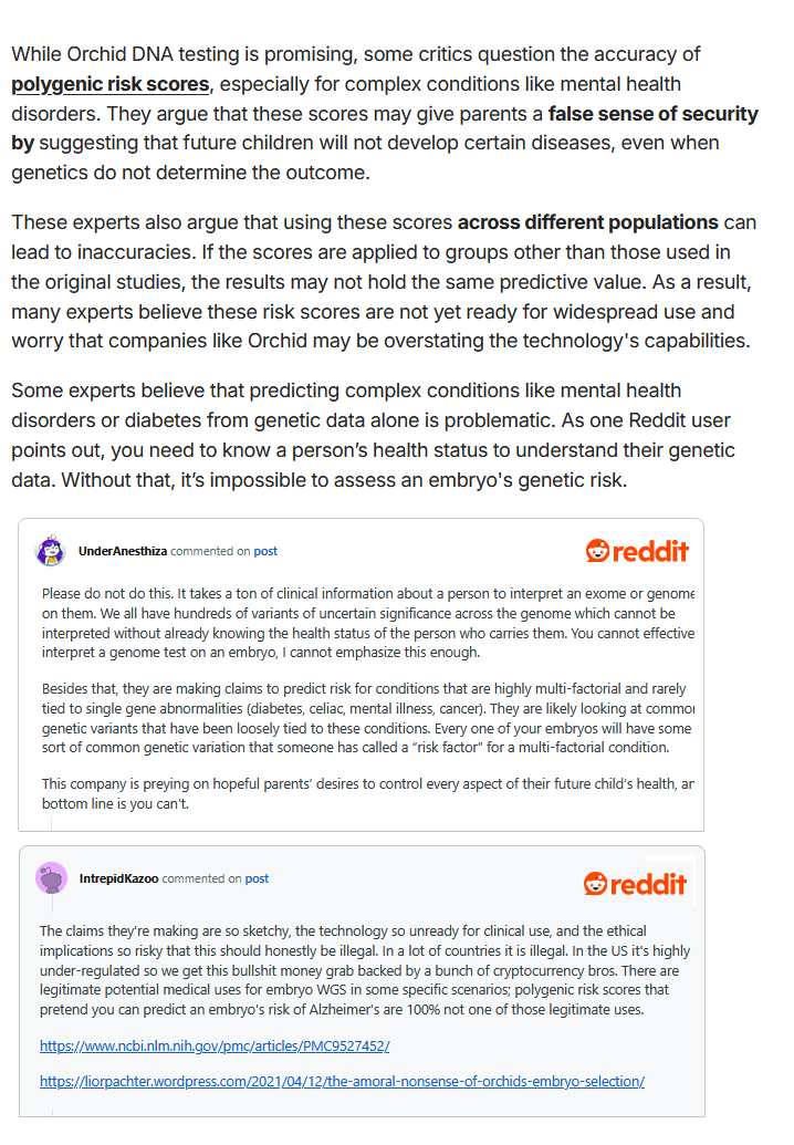 …which included a section on how Orchid is a polygenic selection company, and polygenic selection companies are inherently “sketchy” and “honestly should be illegal”. But Nucleus is also a polygenic selection company! This is like Marlboro attacking Camel on the grounds that cigarettes are addictive and should be banned! Obviously something went wrong here - my guess is AI - and it’s a really bad look, especially when these scientific issues are so hard to litigate, and so many of us will have to go off gestalt impressions of corporate culture.