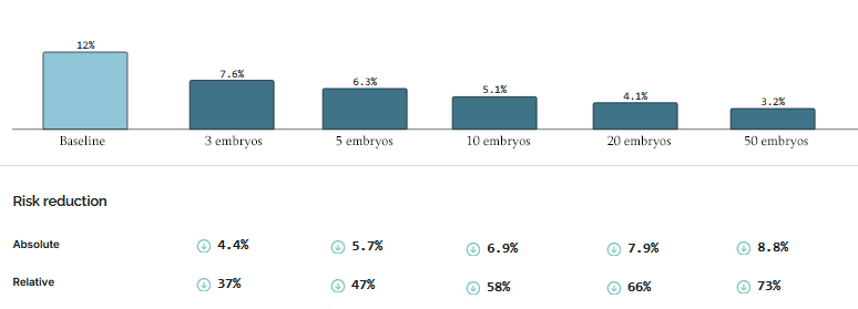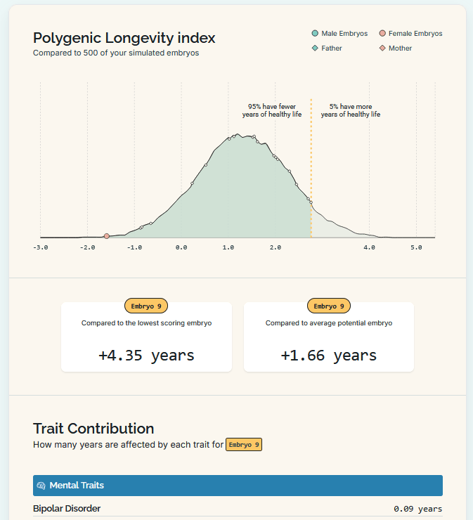 For Herasight, it’s a “polygenic longevity index”. They don’t give exact risk reduction numbers for each disease, saying that it depends too much on a couple’s specific family history, but say that it most people gain 1-4 years of healthy life (when I test it on a set of twenty embryos, the the healthiest gets an extra 1.66 years).