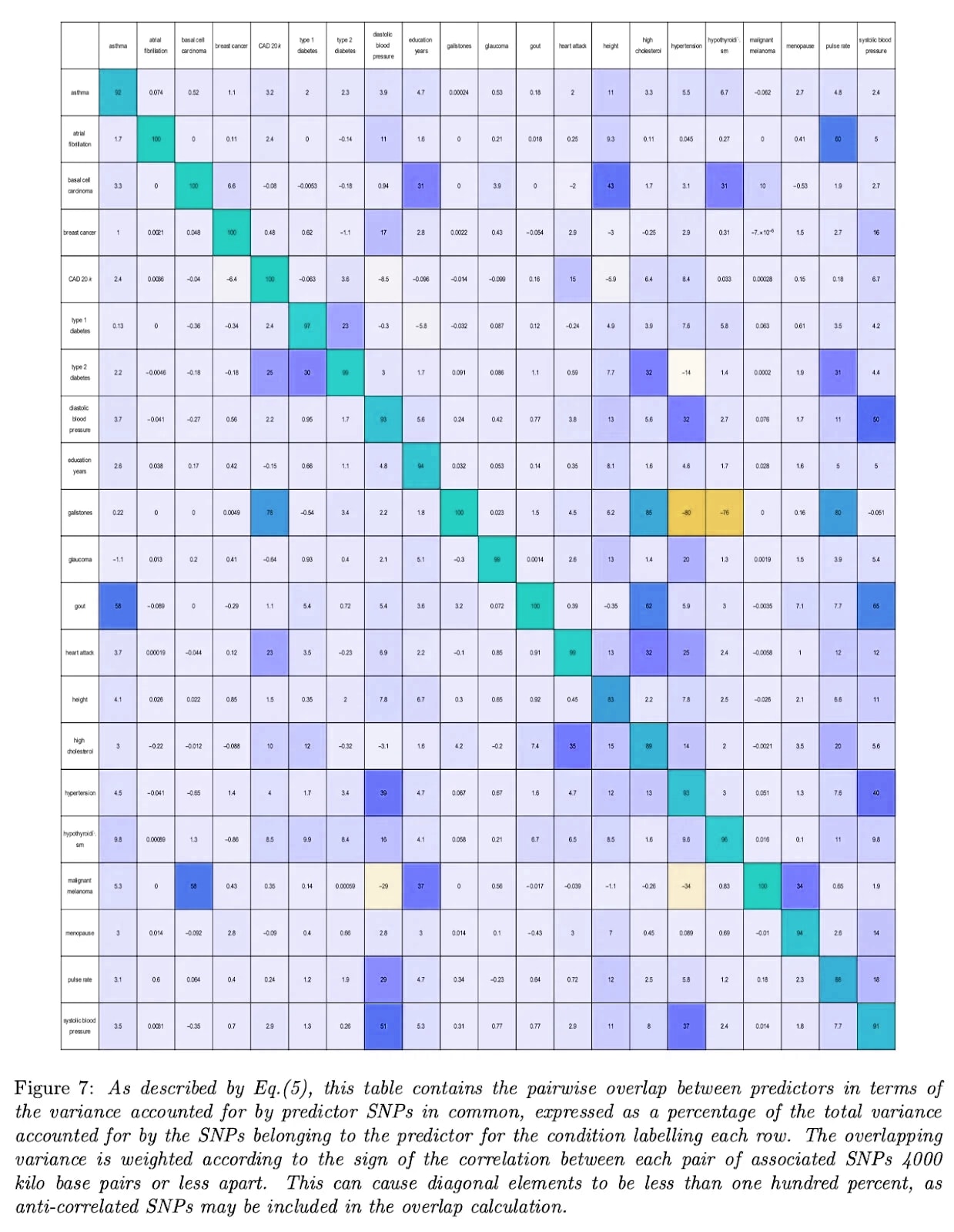 Aside from two bright orange squares (gallstones vs. hypertension and hypothyroidism - I don’t know what’s up with this and it doesn’t seem to be a widely-appreciated result) we see that most correlations are zero or positive - that is, selecting against one disease selects against another or at worst does nothing. In this ocean of blue, worrying about those few orange squares feels a bit motivated.