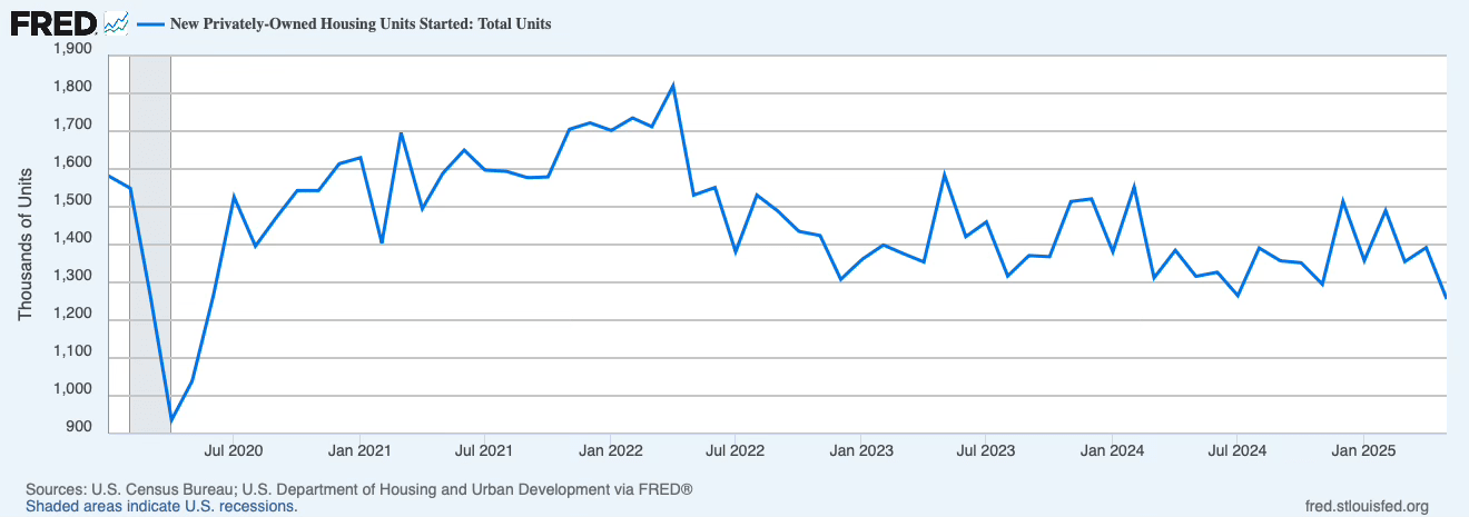 The housing market tells its own story of middle-class dreams deferred. Despite the good work of YIMBYs getting rid of zoning and trying to make it easier to expand housing supply. The insufferable rate increases since 2022 work to suppress new housing starts lower and lower. With 30-year mortgage rates stuck between 6% and 7% (double their 2021 lows), the median home now requires over a full year of household income for a down payment. Monthly mortgage payments consume 35% of the median household's income — a level that would have been considered predatory lending a generation ago.