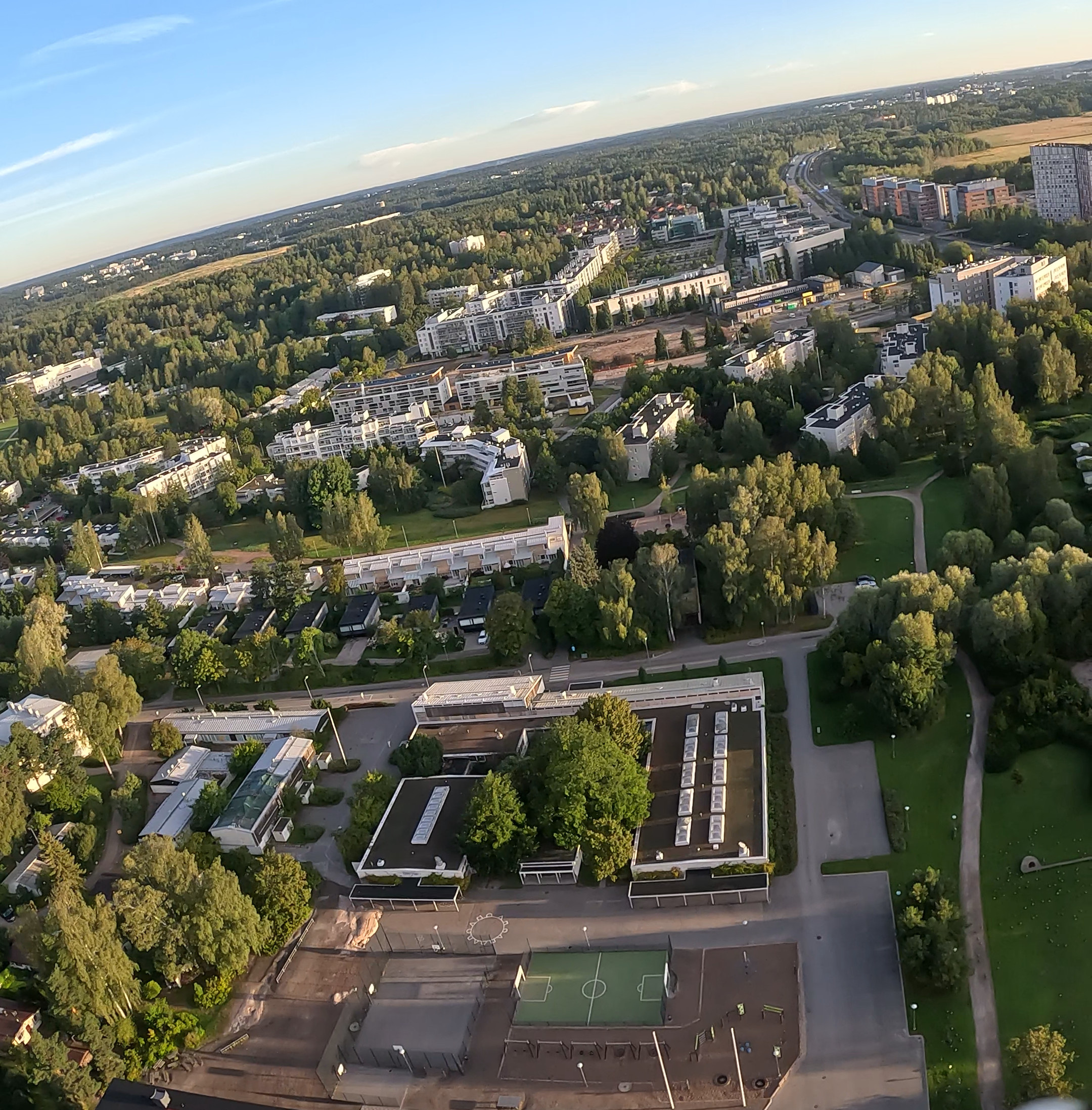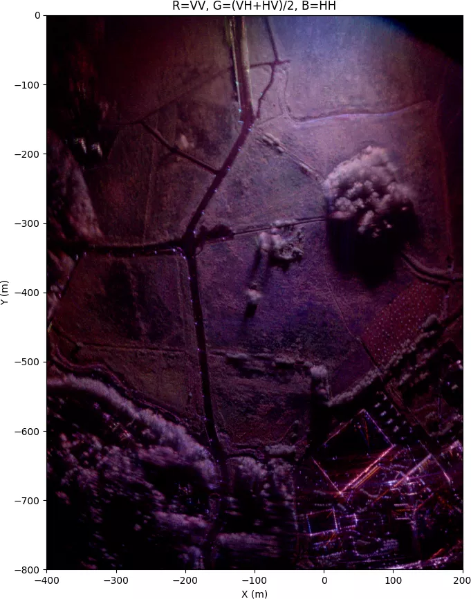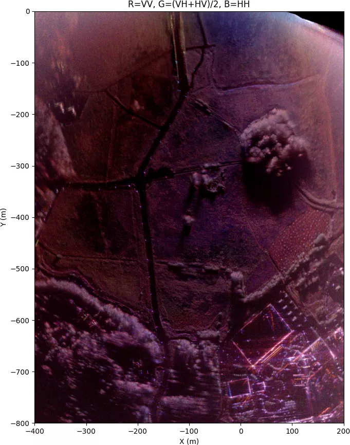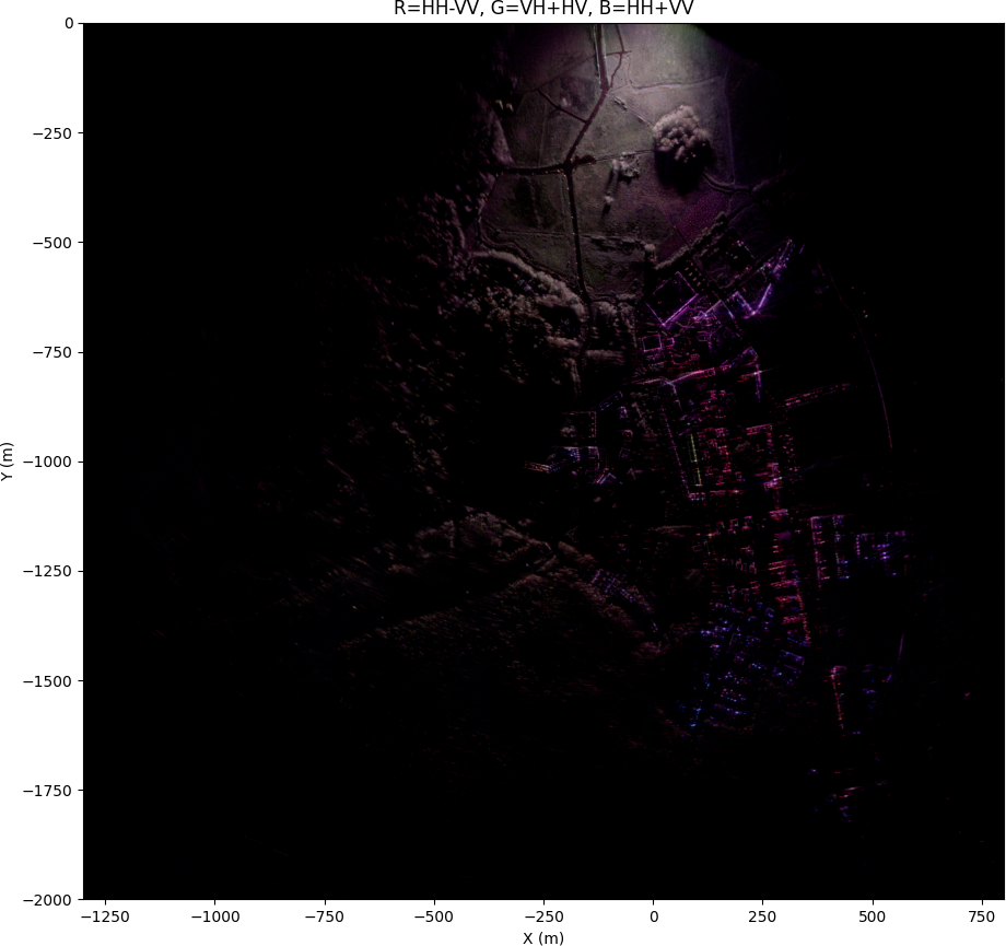In the fully zoomed-out image, quite lot of details can be seen even at long distance, but the grazing angle at far away is very low, so only tree tops and buildings are visible and shadowing is severe. This is without antenna pattern normalization, since it doesn't make sense to normalize to flat ground that isn't visible at long range, but the polarimetric calibration is still applied.