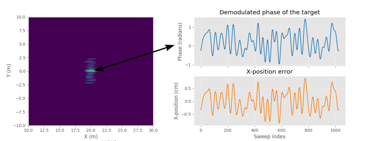 Calculating the demodulated target phase (\(\xi_{n,p}\)) for the previous example scene gives a phase that matches very well with the X-position error that was added to the radar position. Shifting the phase of the input data by negative of the \(\xi_{n,p}\) would result in a constant phase, which results in a focused target in the image.
