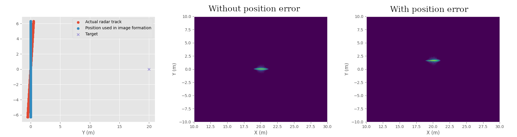 SAR image example with one point target, with and without linear error in radar position. Radar track and target position (left), image processed without position error (middle), and image processed with linear position error (right) causing shift in the image.