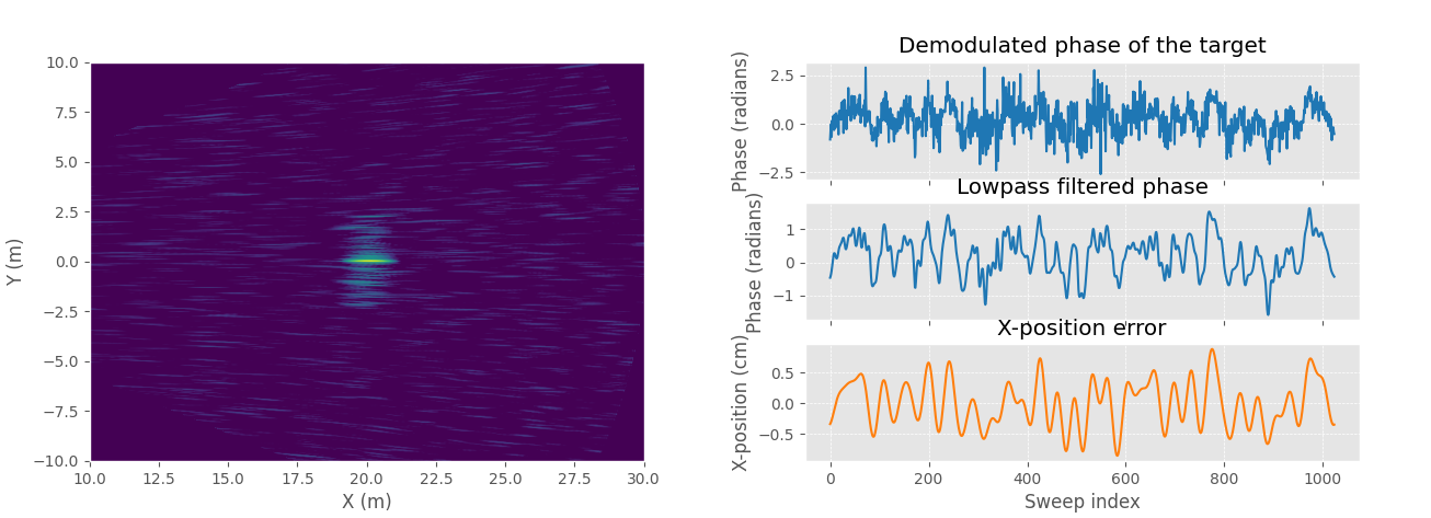 Low-pass filtering will improve the phase error estimation when phase error is slowly varying. SAR image with noise and position error (left) and demodulated phase of the target with and without low-pass filtering (right).