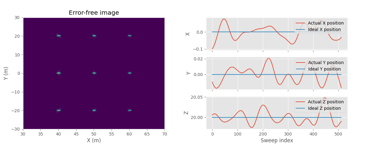 Note the scale of the position error that causes the blurring in the simulate image. The maximum error is only 1 cm, but even this small error causes significant loss in the image quality. Since the image formation relies on the phase, position error must be much smaller than wavelength to not cause phase errors during image formation. In this case the simulation uses 6 GHz RF frequency which corresponds to 5 cm wavelength.