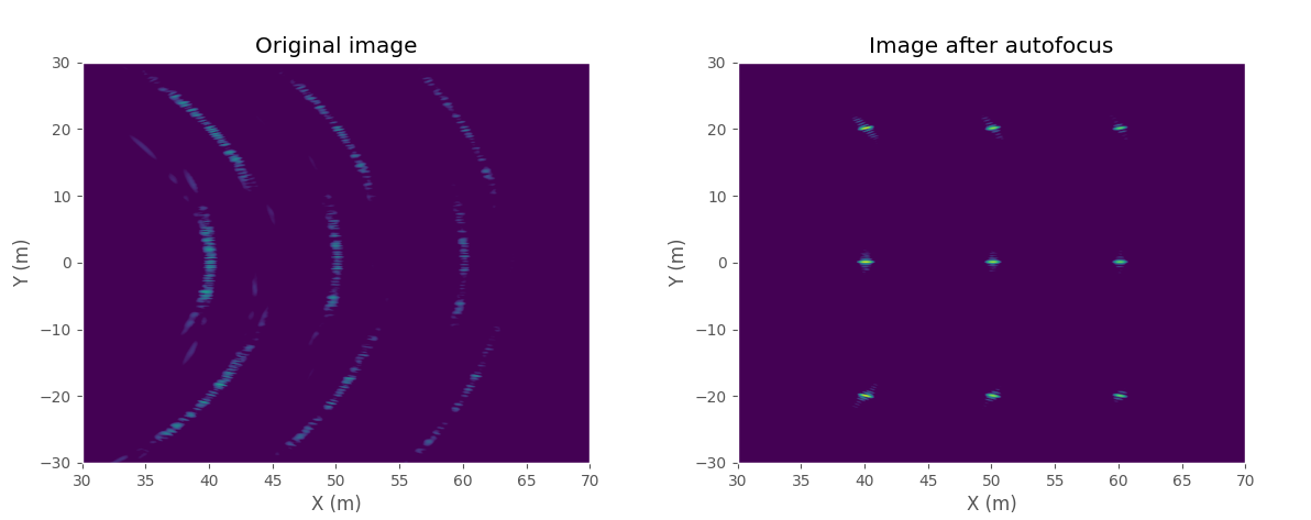 I made a small synthetic example with nine point targets in a grid. The height of the radar was set to 20 m and it moves linearly along Y-axis sampling every quarter wave length (12.5 mm / 0.5 inch). I added random low frequency 3D position error to the radar position and used the corrupted position to form the initial SAR image.