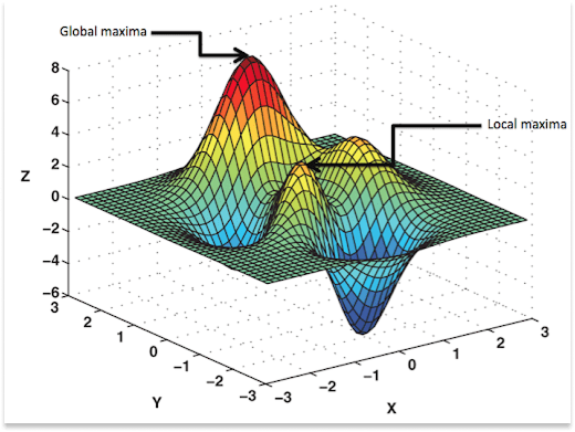 In 1989, Stuart Kauffman released a paper examining The NK model of rugged fitness landscapes. You can think of a rugged fitness landscape like a mountain range with peaks of different heights. If you’re climbing a smaller hill, improvements can get you to the top of that hill, the local maxima, where you get stuck. Any move you make takes you back down the hill; you’re trapped.