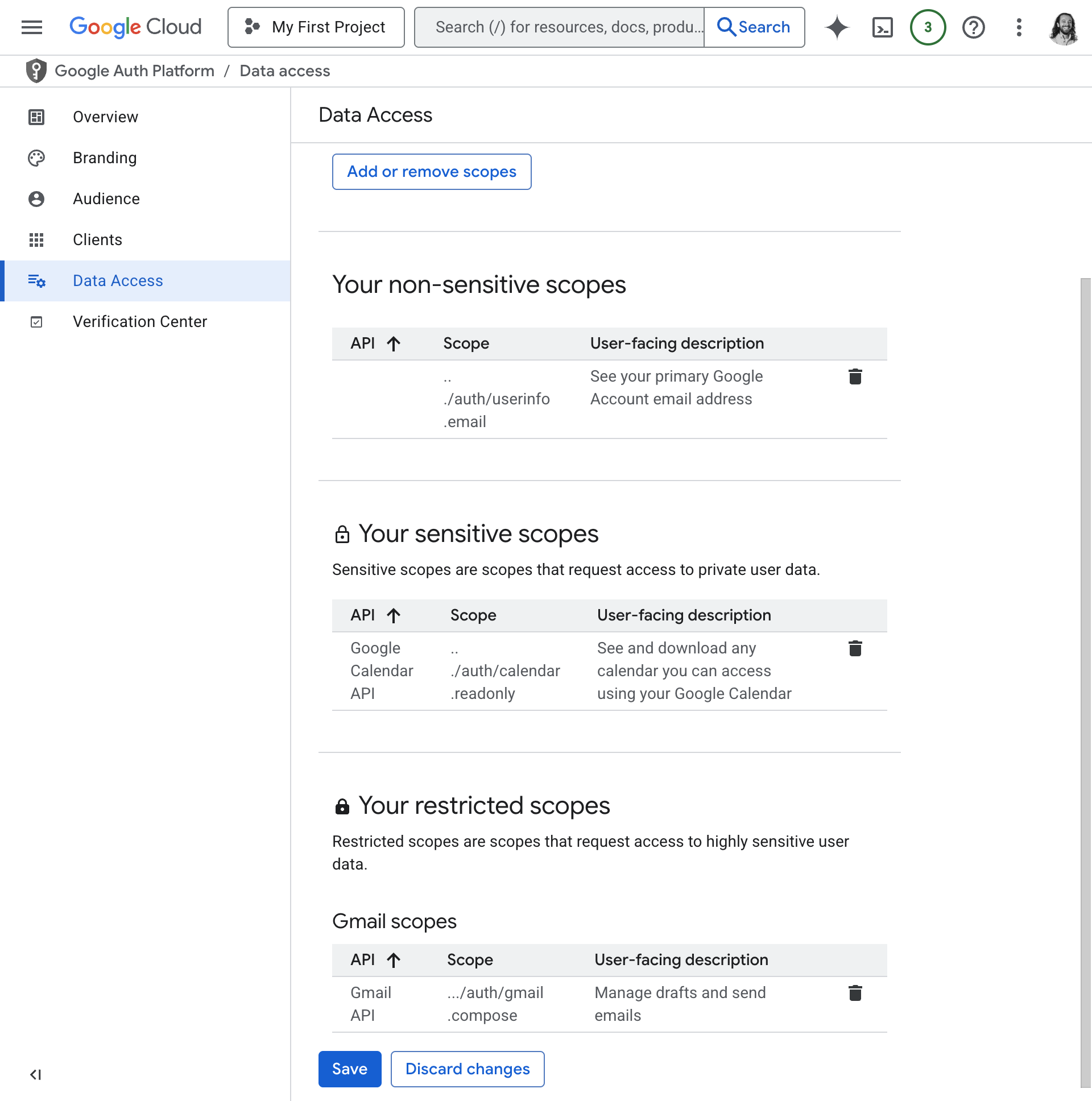 Go to the Data Access section of Google Auth Platform. This is where you can declare to Google the set of OAuth scopes you intend to request access to.