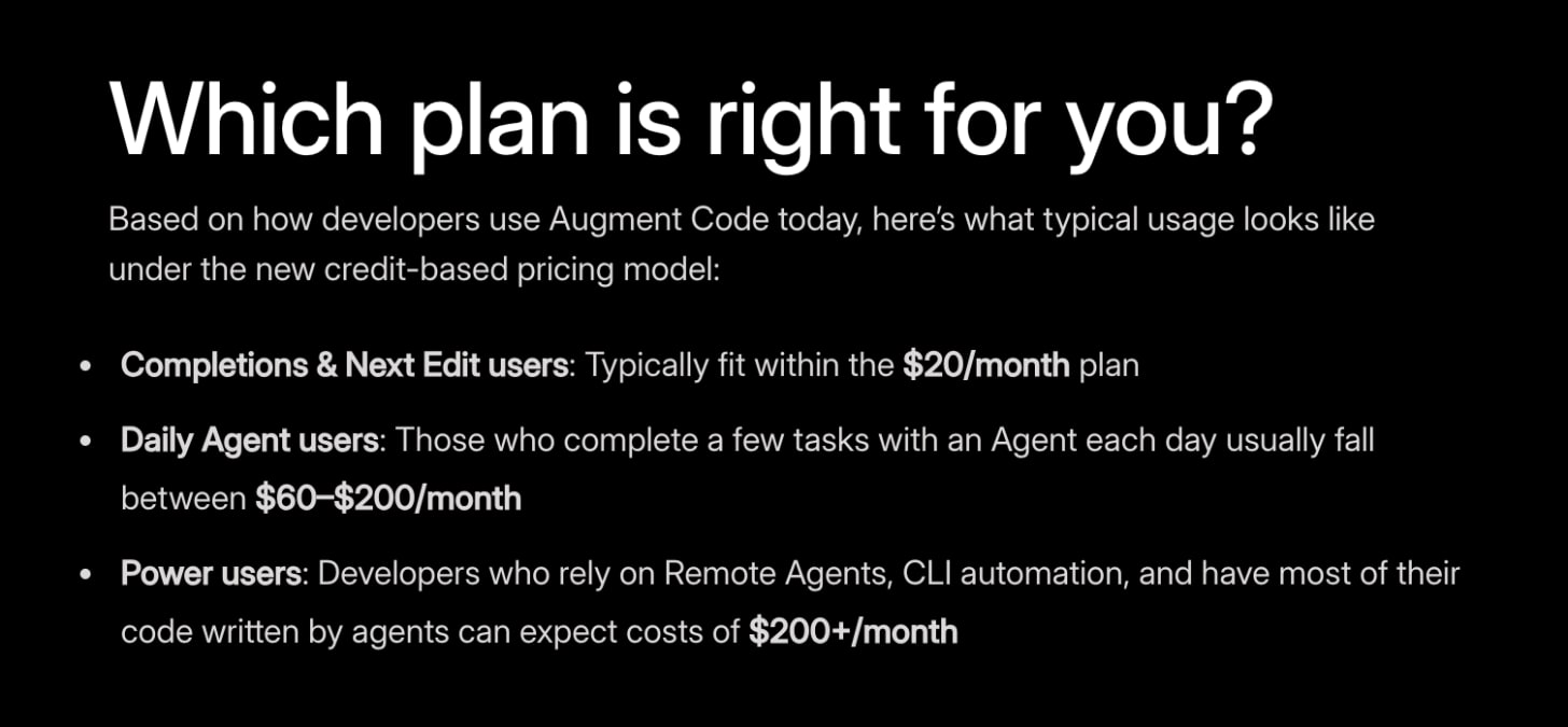 Augment Code’s pricing update makes specific claims: “Completions & Next Edit users typically fit within the $20/month plan,” while “Daily Agent users who complete a few tasks each day usually fall between $60-$200/month.”