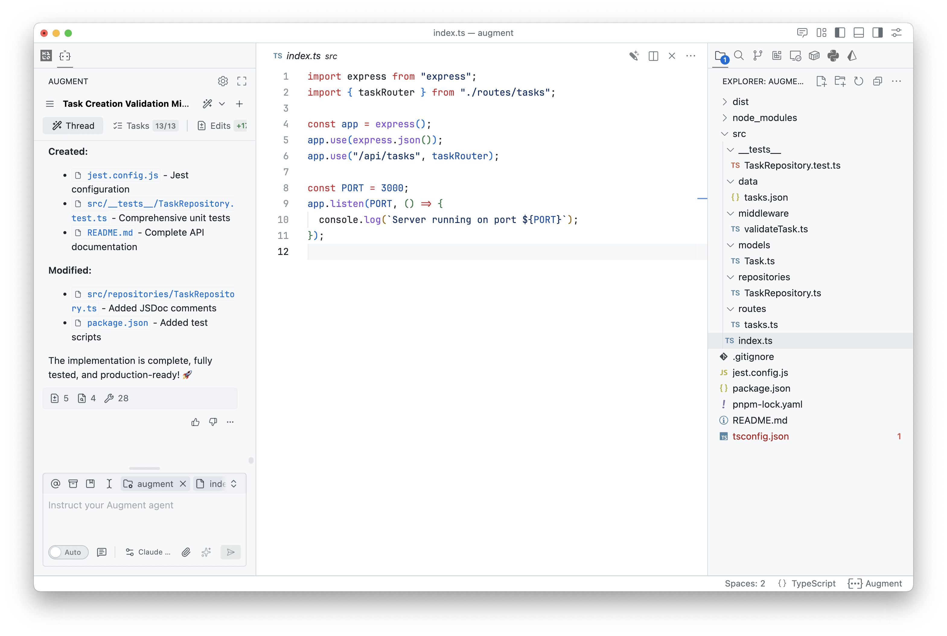 We created a Node.js, TypeScript, and Express project with a simple task management API and used the same base project for both Augment Code and Kilo Code.