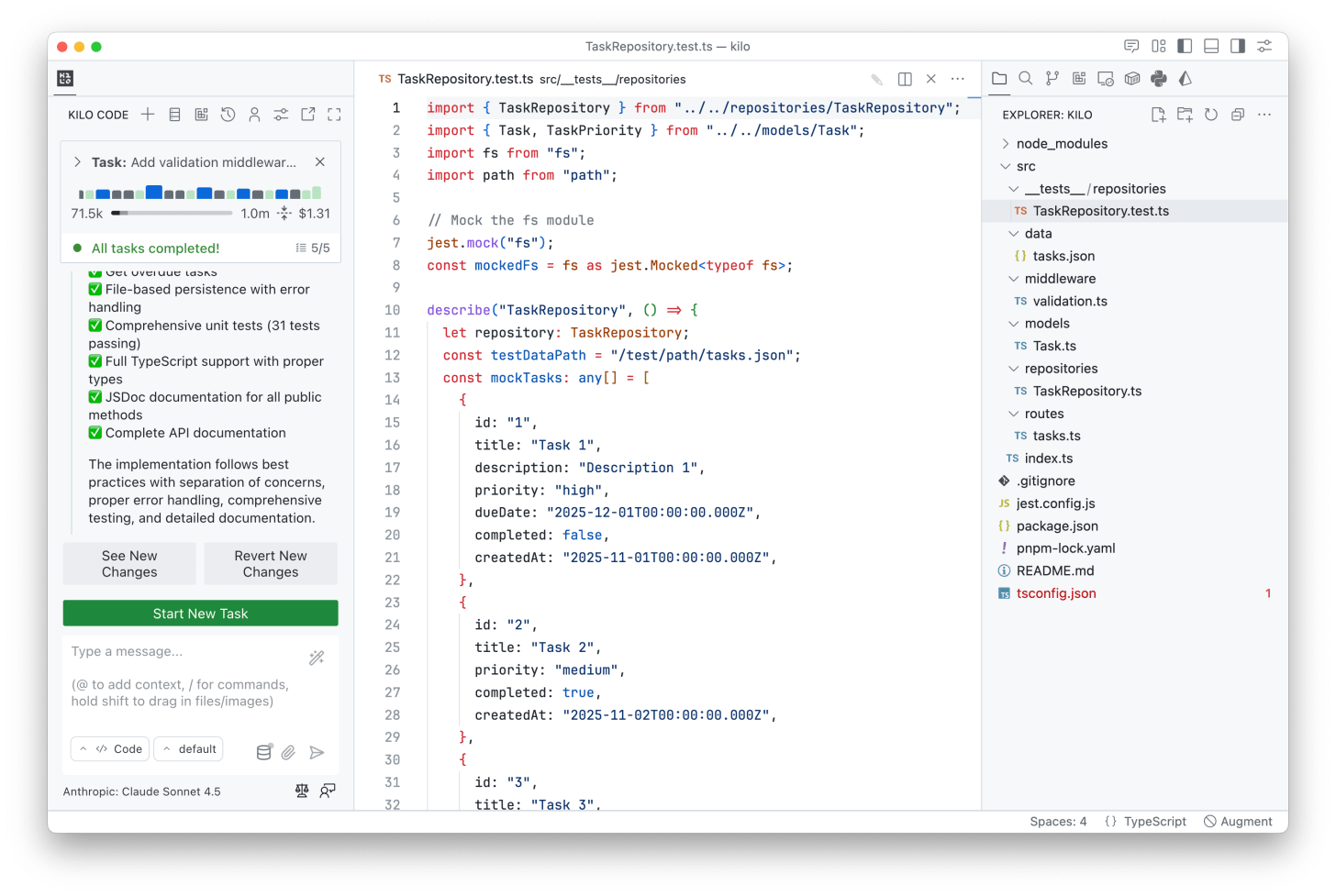 Prompt: “Write Jest unit tests for the TaskRepository class, testing all CRUD operations including error cases. Mock the file system. Also generate JSDoc comments for all public methods and create a README.md with API documentation including example requests and responses.”