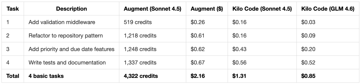 Models used: All Augment Code tests used Claude Sonnet 4.5, their recommended model for coding tasks. For Kilo Code, we tested with both Claude Sonnet 4.5 (for direct comparison) and GLM 4.6 (to demonstrate cost savings with budget models).