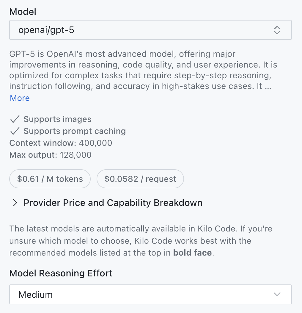 In Kilo Code, you can set models like GPT-5 to high, medium, or low reasoning effort based on task complexity. Reasoning is the process where AI models “think through” problems step-by-step before providing answers, similar to how humans work through complex problems on paper before finalizing a solution. Higher reasoning improves results for complex tasks but costs more. Lower reasoning saves money on simple tasks and typically results in faster response times. Augment Code locks these settings, removing another cost and performance optimization lever.