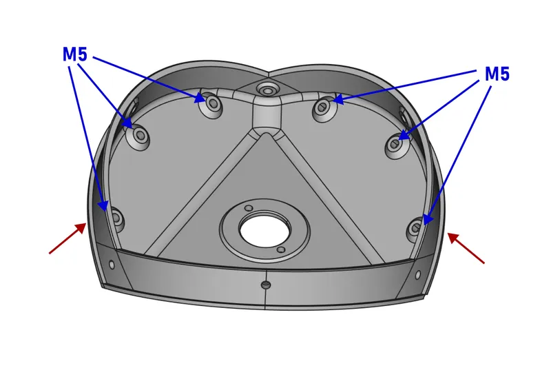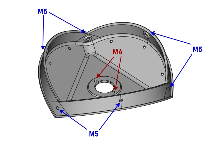 - 42 Threaded inserts M5 for assembling the central piece and the arm shells