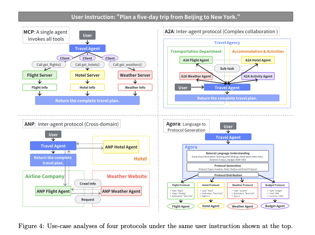 To understand how these protocols differ in practice, let's look at how each would handle the same task: planning a five-day trip from Beijing to New York. The architectural differences reveal when you'd choose each approach.