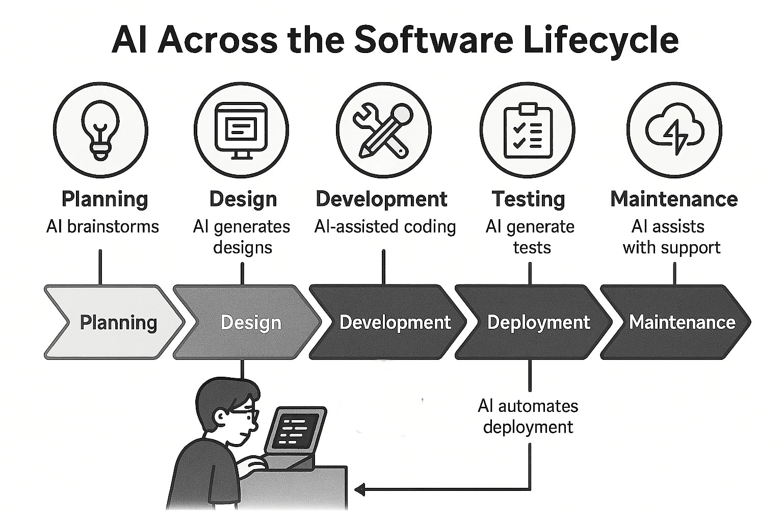 Now that we’ve looked at tools, in the next section we’ll zoom out and walk through how to apply AI across the entire software development lifecycle, from design to deployment. AI’s role isn’t limited to coding; it can assist in requirements, testing, and more.