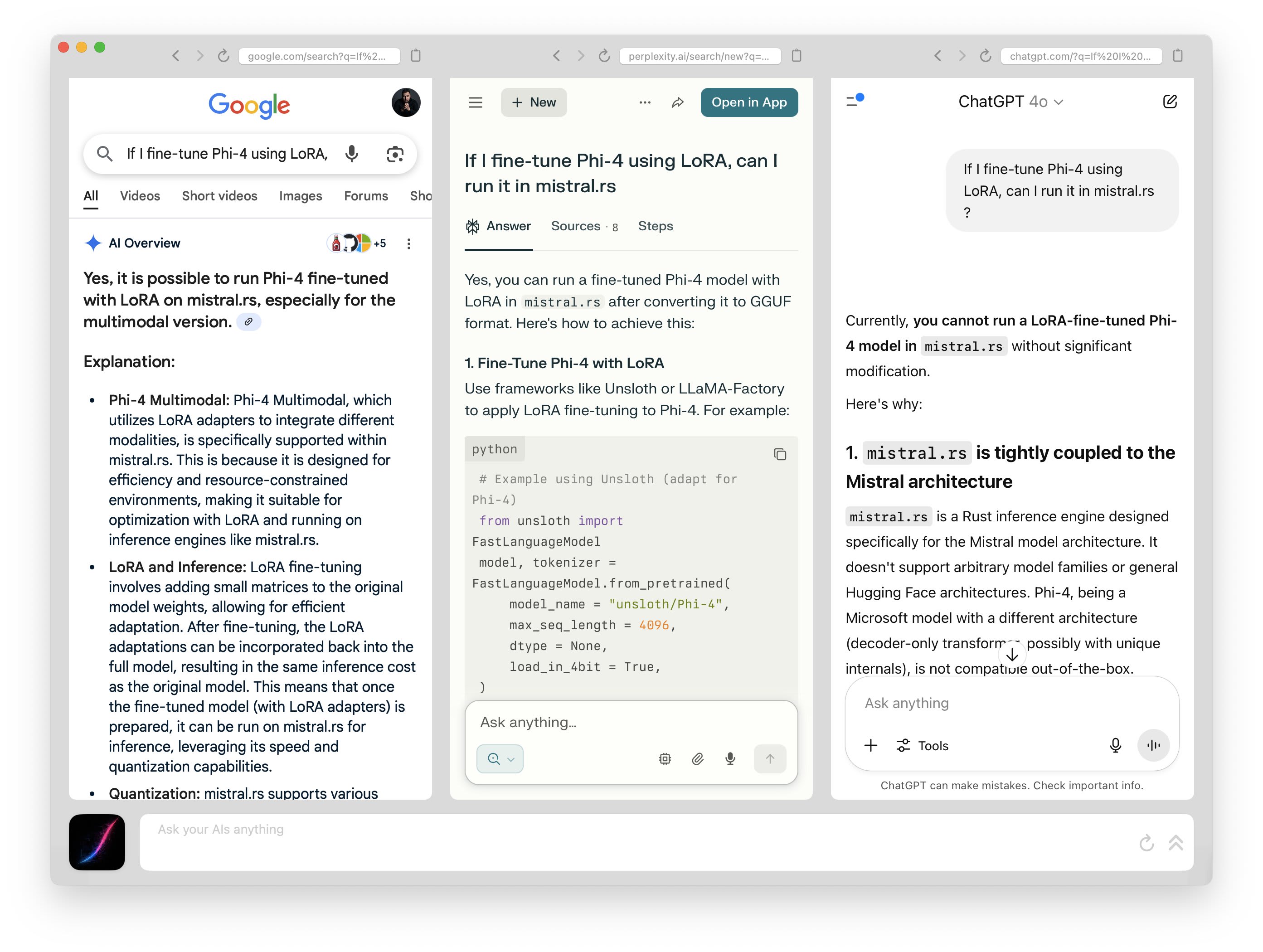 Hyperchat is a simple macOS app that loads Google, Perplexity, and ChatGPT side by side. Ask once, get three simultaneous answers.