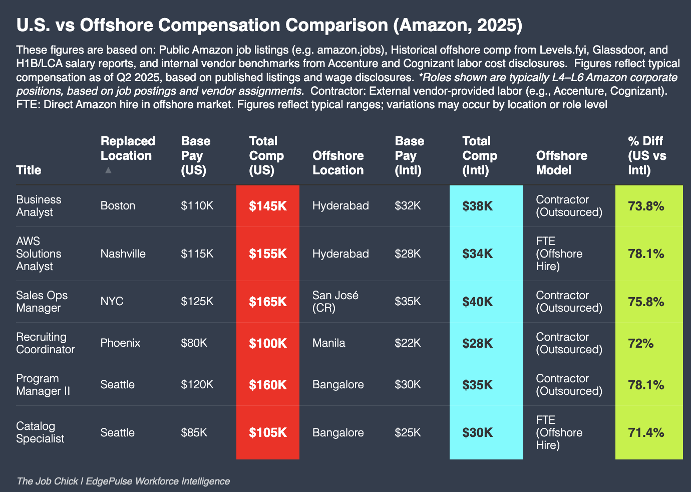 In the past 18 months, Amazon cut tens of thousands of U.S. corporate roles, and then rebuilt capacity offshore, with cheaper labor, more automation, and a conveniently timed AI narrative. This isn’t theory. That relocation info wasn’t on the news either.