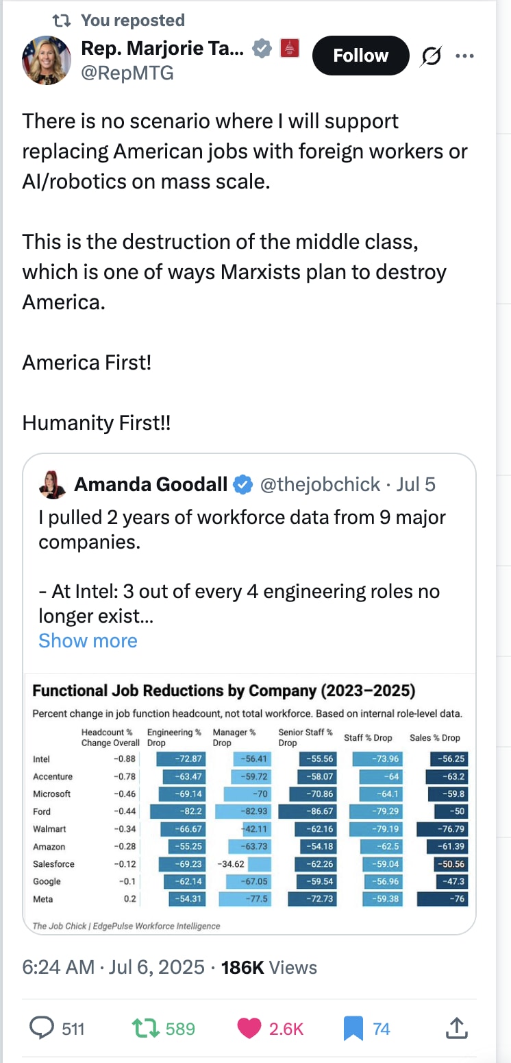 My post even caught the eye of political figures like Marjorie Taylor Greene. Whether you agree with her or not, the bipartisan spotlight on workforce restructuring is growing, and companies can’t afford to ignore the optics anymore.