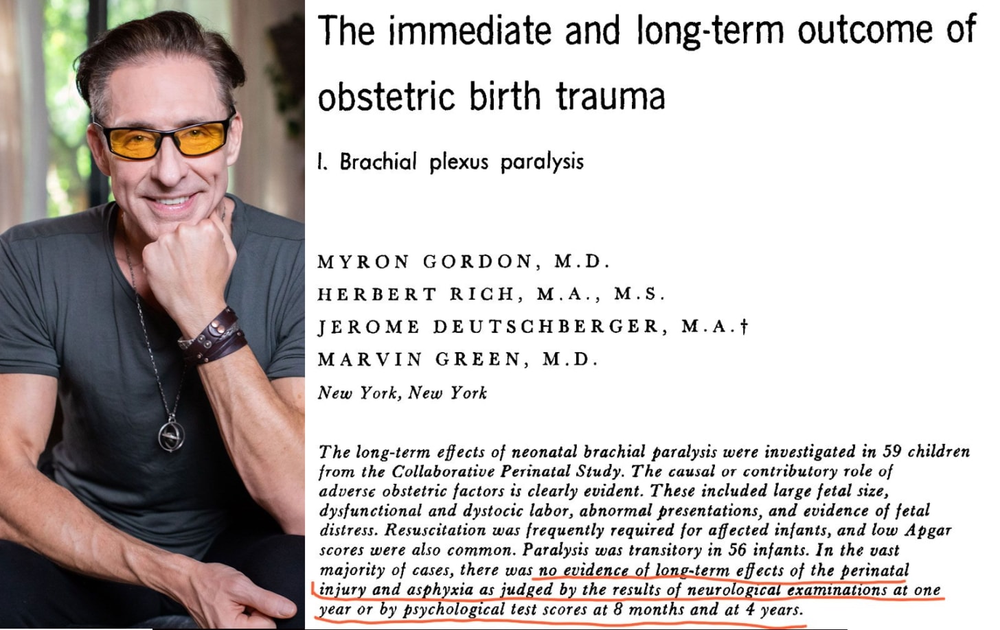 The paper in fact very clearly proves Dave’s claim wrong. Actually, considering Dave specifically clarified that he “didn’t suffer oxygen loss or anything like that” during the birth, it proves he’s extra wrong. The paper found that even in newborns whose birth was so physically damaging that they did experience clear damage like oxygen loss or temporary arm paralysis, there was no lasting psychological damage.