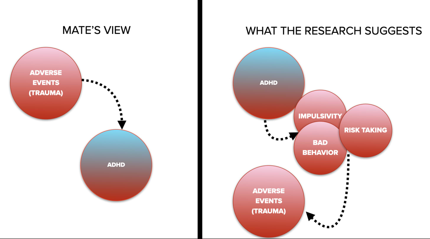 As I talked about in this article, this confusing the chicken for the egg is the same reason Gabor Mate’s view that trauma causes ADHD is mistaken. ADHD expert Dr. Russel Barkley explained this in his video Why Dr Gabor Mate is Worse than Wrong about ADHD. What happens is that children with ADHD have bad experiences because their easily-captured attention makes them impulsive and willing to take risks, their bad behavior frustrates those around them which leads to social consequences and so forth. That is, the ADHD leads to very negative experiences. Having had negative experiences (trauma) doesn’t lead to ADHD.