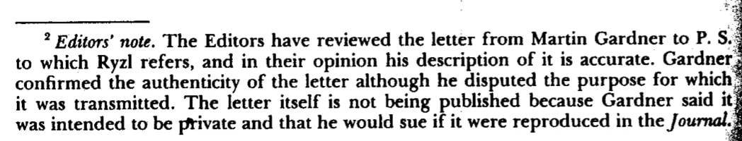 Shortly after this article posted, journalist and researcher Stacy Horn sent me from her records a copy of Martin Gardner’s reply to Hubert Pearce, In the interest of fairness and others’ research, I am reproducing it here: