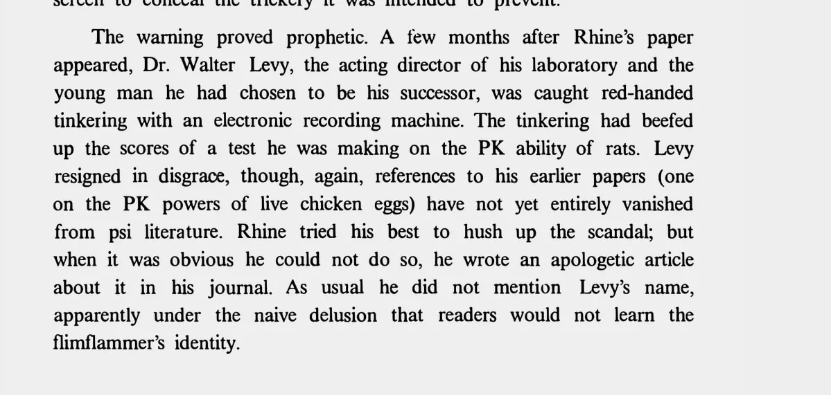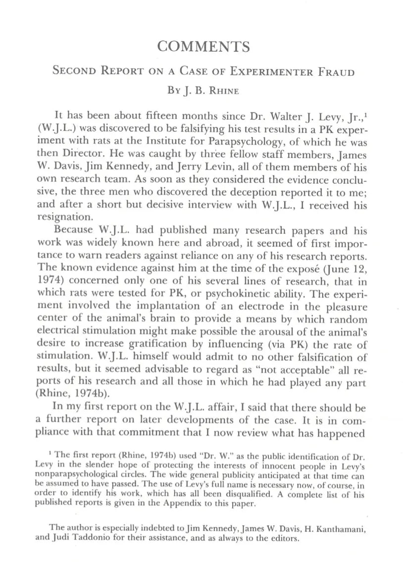 In the early 1970s, J.B. Rhine’s then-independent lab (faced with declining institutional support his center had migrated off [Duke University’s] campus) was itself rocked by a fraud scandal. A charismatic and driven medical student handpicked by Rhine as his institutional successor was caught faking results. Rhine was resolute and transparent in rooting out and exposing the fraud and laying groundwork for improvements.