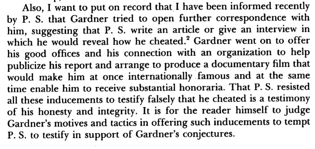 Gardner wrote to Stepanek and suggested that he give an interview describing how he cheated. Gardner offered to help publicize it and arrange for a documentary film that would bring him money and fame. Stepanek refused, a fact that tends to support his honesty. Some may see Gardner’s attempt as one of bribery to suborn testimony. He seems to have been embarrassed by the matter, and when his letter to Stepanek became known, he threatened to sue if it was published.