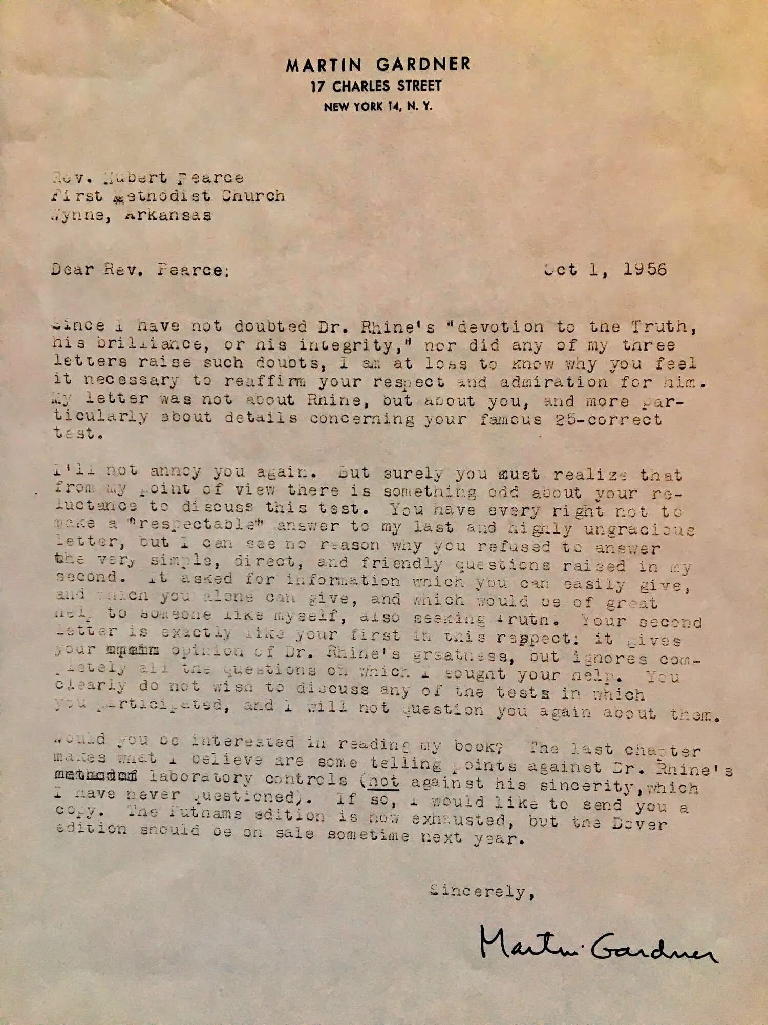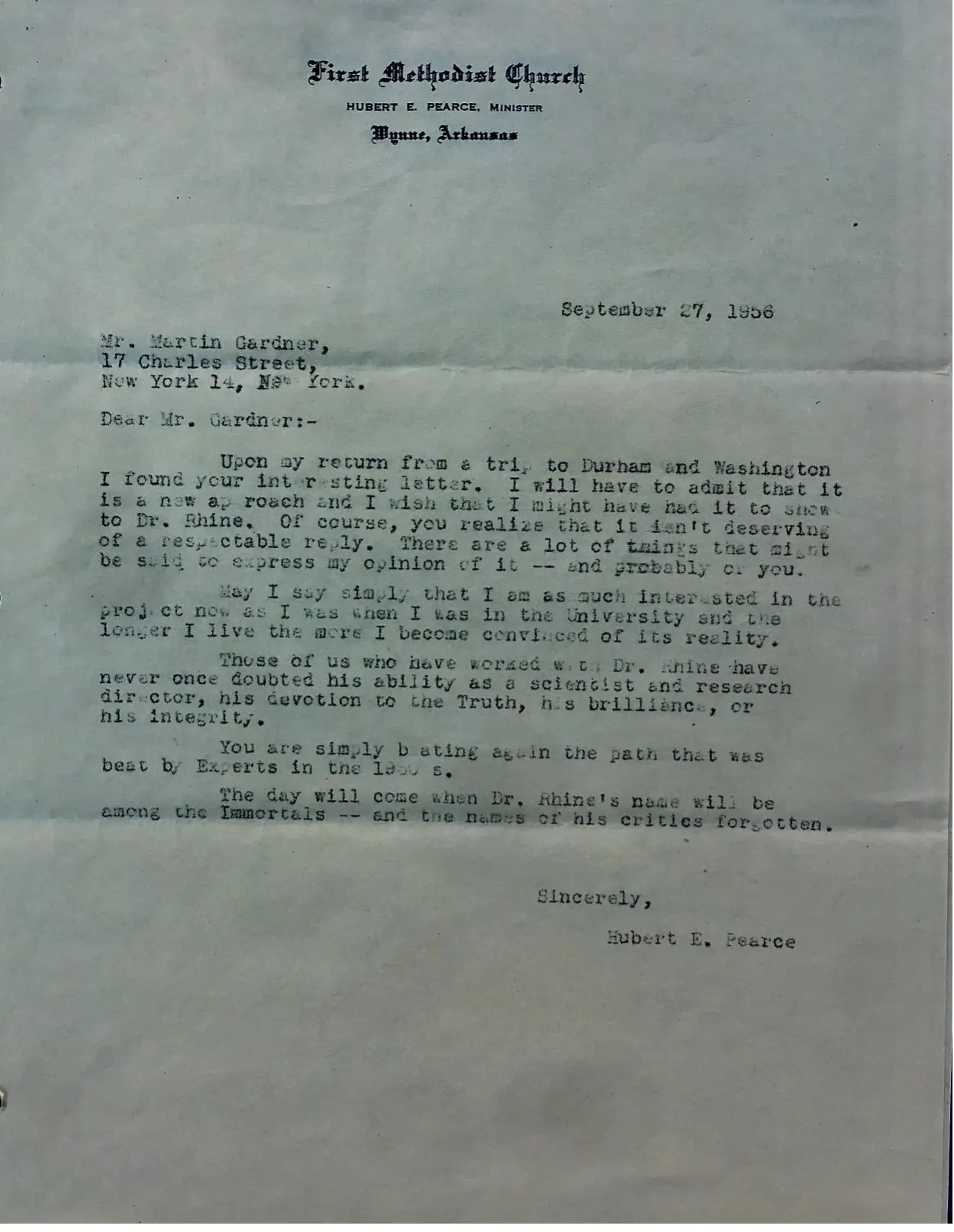 As it happens, Pearce had already replied to Gardner, which goes unmentioned. The skeptic wrote Pearce, then a Methodist minister, in 1956 apparently asking if he would like to come clean about practices in the lab. I do not have Gardner’s original letter. Pearce’s son, Warren, recalled: “Martin [Gardner] was clearly questioning Dad’s honesty in the tests by asking him if it hadn’t been long enough that my father’s conscience was bothering him to where he was ready to confess that the work there was not well controlled, etc.”