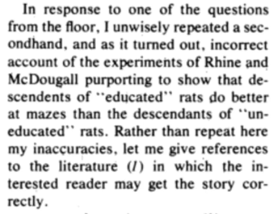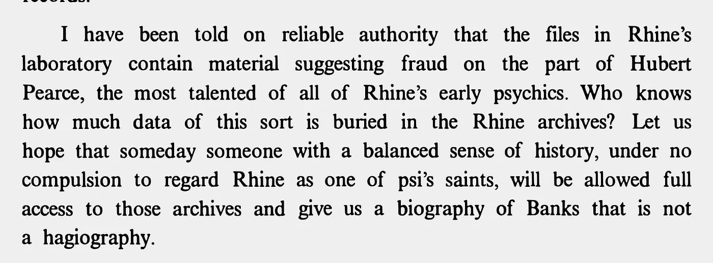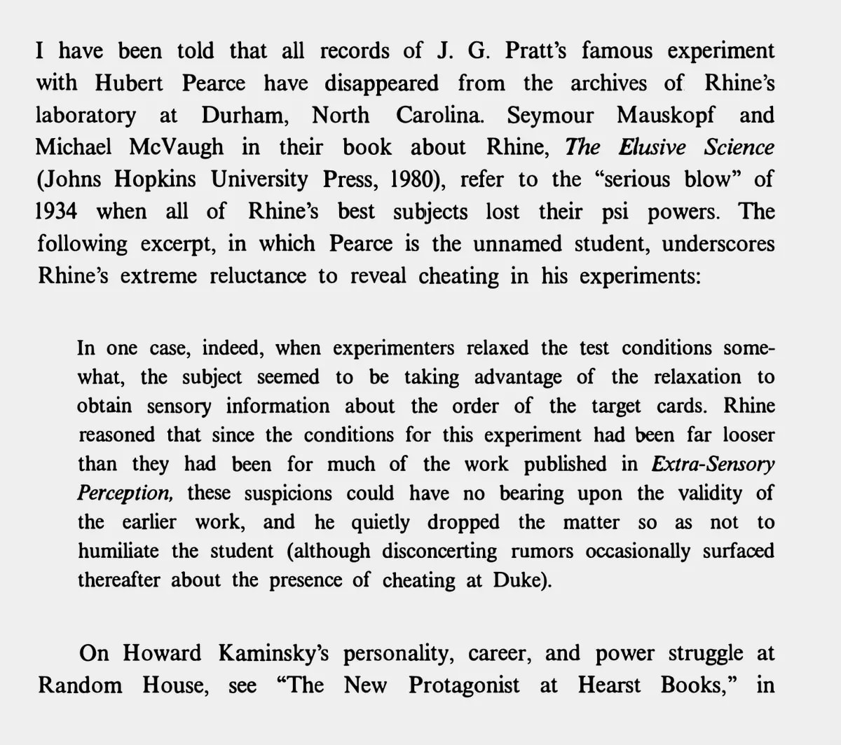 By “the incident,” Gardner references a singular trial where Pearce scored 25/25 on Zener cards; Gardner gives no evidence of Pearce-Rhine malpractice but notes that Rhine, as was his custom, invited a prominent British skeptic, C.E.M. Hansel, “to visit his laboratory, then affiliated with Duke University, to look over his records. This proved to be bad judgment.” Leaving aside the visiting skeptic’s nearly vaudevillian supposition that Pearce repeatedly crawled through a ceiling space to peek at cards through a trapdoor over the lab [7], consider the appalling cynicism of Gardner’s riposte. How can research transparency ever be “bad judgment”?
