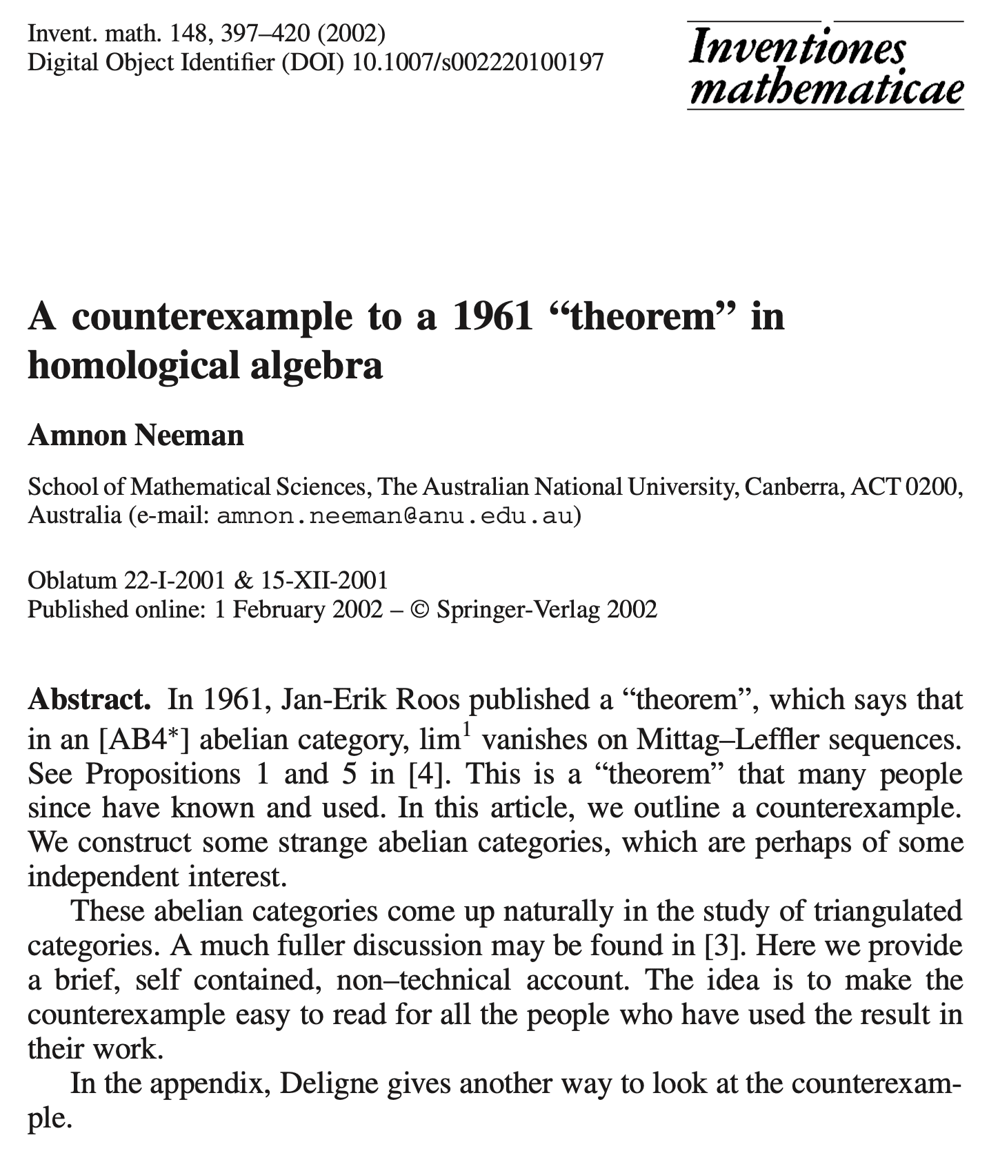 Aussie mathematical humor is a niche genre that has historically struggled to break into the mainstream, but it has a definite shot at eternal glory with Neeman’s deadpan title—A counterexample to a 1961 “theorem” in homological algebra—and opening paragraph: