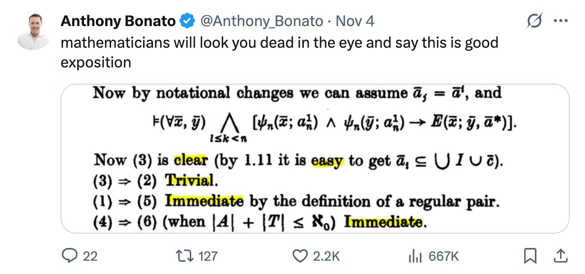 The current incarnation of this millennial quest is the titanic effort to formalize mathematics, that is, to re-implement existing theorems and proofs within formal “proof assistants” such as Lean. Indeed, while extant mathematics may seem formal to outsiders, this isn’t really the case—it is merely written in a “mock” formal language that mixes abstract symbols with handwaving, and it is a running joke that most proofs are full of gaps. That wouldn’t eliminate the need for human-readable proofs (that cannot span gigabytes), but it would ensure that they are backed by machine-verified formal derivations.