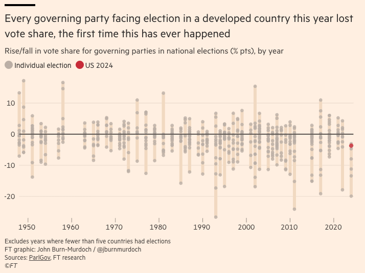 In 2020, Joe Biden won by promising that he could restore normalcy to American life. That did not happen. As the biological emergency of the pandemic (death) wound down, the economic emergency of the pandemic (inflation) took off. An affordability crisis broke out around the world. The public revolted. Last year, practically every incumbent party in every developed country lost ground at the ballot box, as the Financial Times reported.