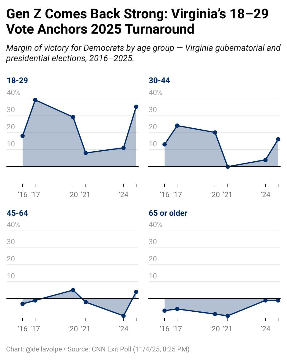 The affordability message was especially successful at bringing young voters back to the Democratic fold. After the 2024 election, I worried that young people were listing to the right. Last night was not the ideal test of that theory, since off-year elections tend to have a smaller and more educated (and, therefore, more naturally anti-Trump) electorate. But it seems as if the rightward wave is now undulating to the left. The pollster John Della Volpe reported that young voters “anchored the Democratic turnaround in Virginia, where 18-29-year-olds delivered a 35-point margin for Spanberger, the largest for Democrats since 2017.