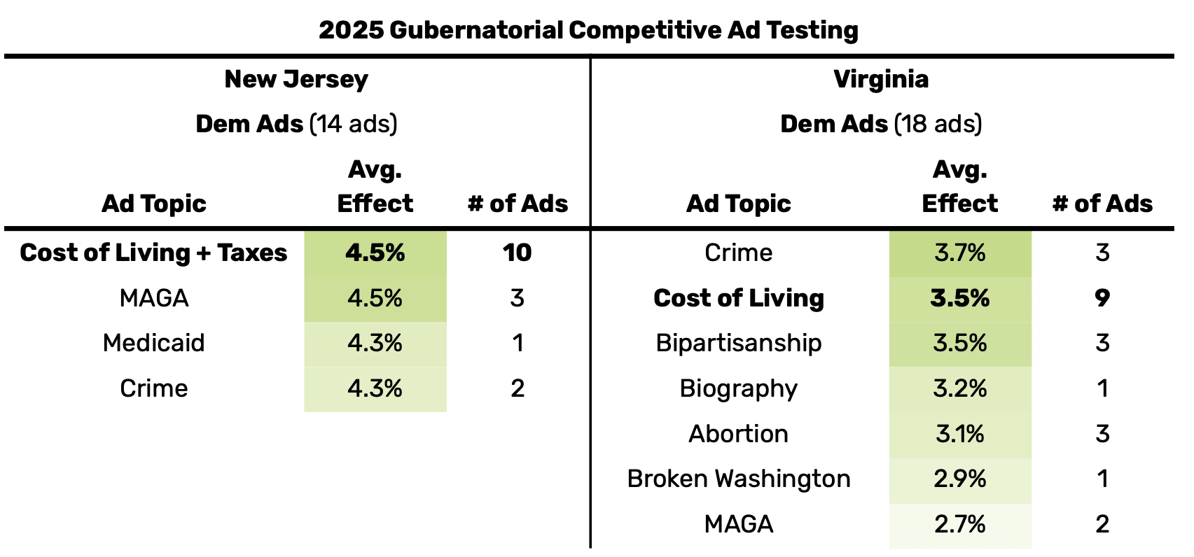 Each candidate arguably got more out of affordability than any other approach. Mamdani’s focus on cost of living in New York—which included some genuinely brilliant ads on, for example, “halalflation” and street vendor permits—has been widely covered. Less ballyhooed, but just as important, is that Spanberger and Sherrill also found that the affordability message had the biggest bang-for-buck in their own advertisements. An analysis shared with me by the polling and data firm Blue Rose Research found that “the best-testing ads in both Virginia and New Jersey focused on affordability, tying rising costs to Trump and Congressional Republicans.”