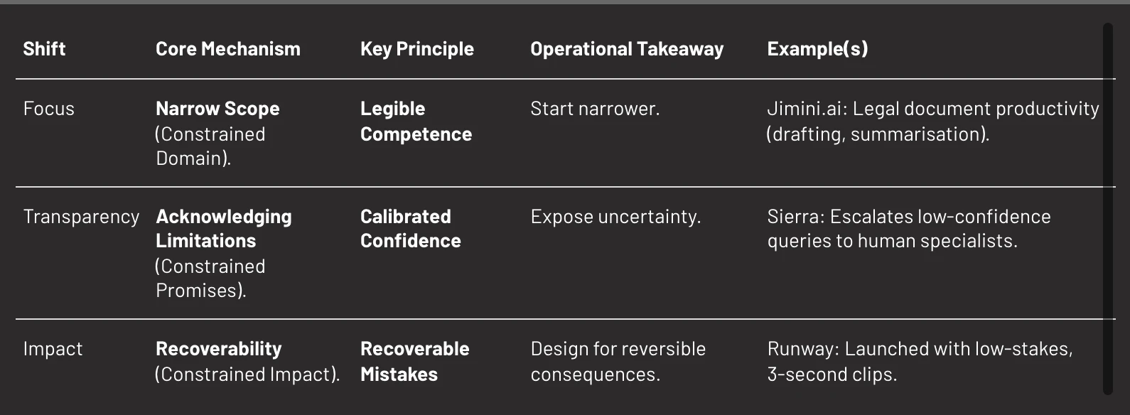 Narrow success makes users receptive to transparency about limitations. When users see the system excel in a constrained domain, they develop confidence in its underlying capability. This confidence makes them willing to accept stated limitations in adjacent areas. Jimini’s lawyers trust document citations in productivity tasks, which makes them comfortable when Jimini says “I don’t yet handle legal research.” The narrow success proves the team knows what they’re doing; the limitation transparency proves they know what they’re not yet doing. Without the initial narrow success, limitation acknowledgment reads as excuse-making. With it, limitation acknowledgment reads as honest calibration.