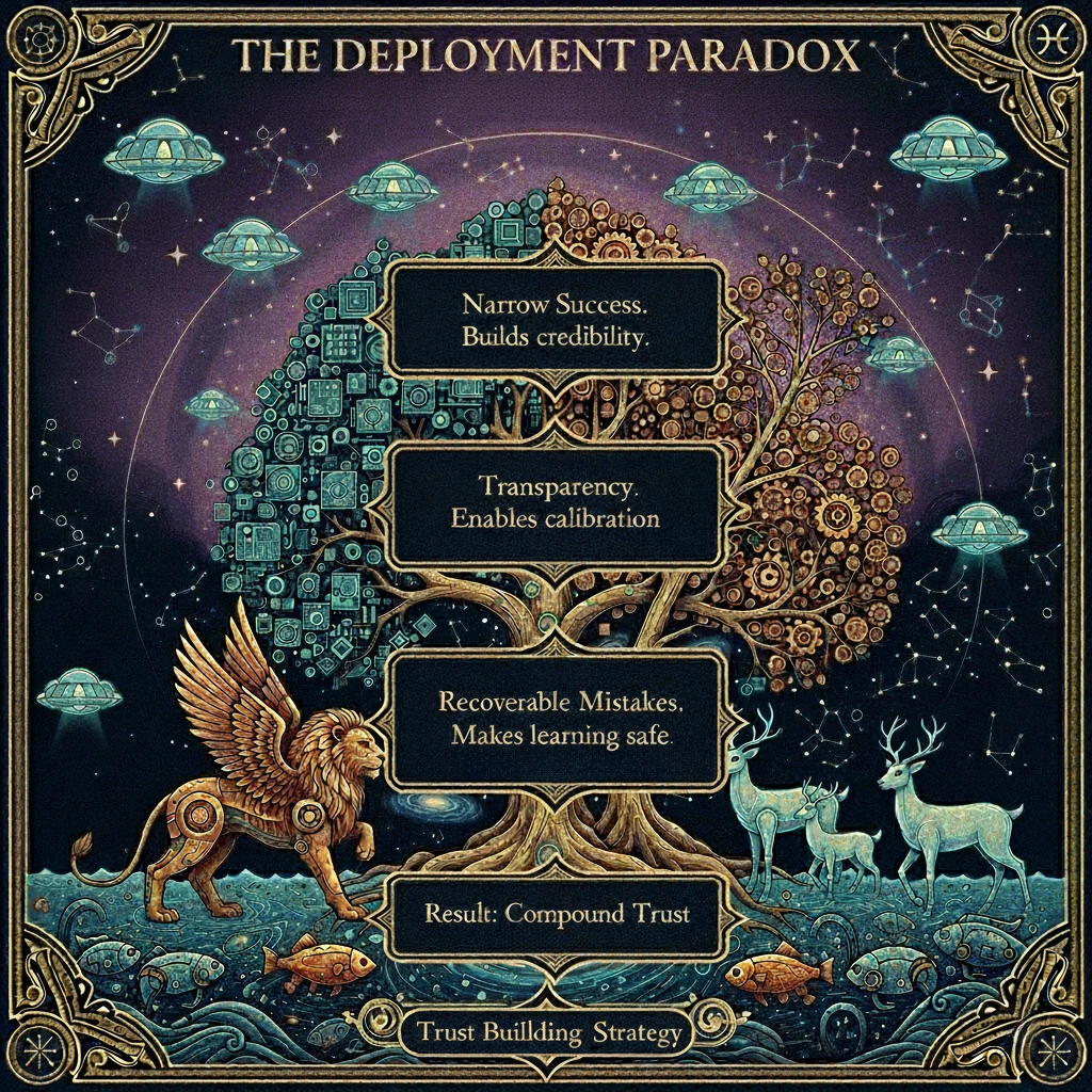 The paradox resolves through strategic constraint design. If you can’t deploy without trust, constrain what must be trusted: limit scope, clarify boundaries, and make mistakes survivable.