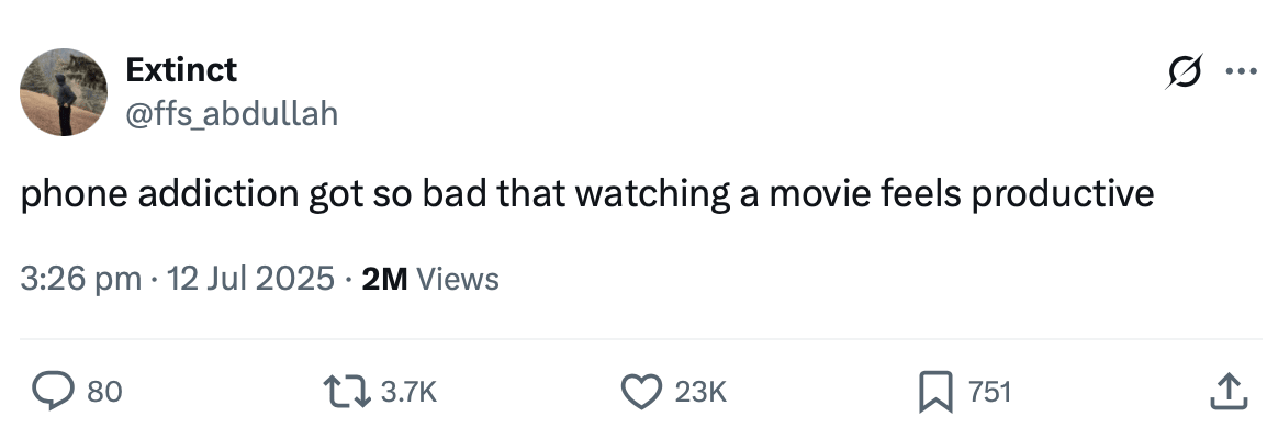 Last week I saw a viral Tweet which read ‘phone addiction got so bad that watching a movie feels productive’. Responses reasonably focussed on the attention span part, the way the addictive nature of the short-form video content we consume on our phones has damaged our ability to engage with longer, meaningful interactions or art-forms — a side effect of what I’ve previous termed ‘phone noise’. Yet I think the post inadvertently touched on something else, too. The obsession with ‘productivity’ is as indicative of our collective social neuroses as our fried attention spans.