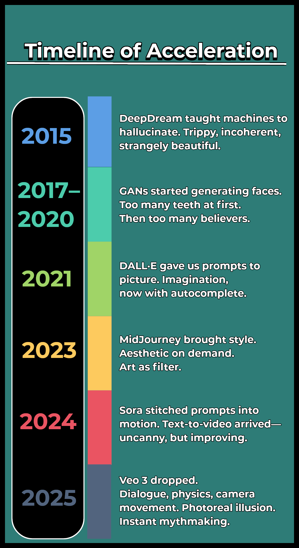 Veo severed the link between what’s seen and what’s true. A clip, no matter how sharp, is just one version of events. Maybe it happened. Maybe it was typed into existence. Maybe both.