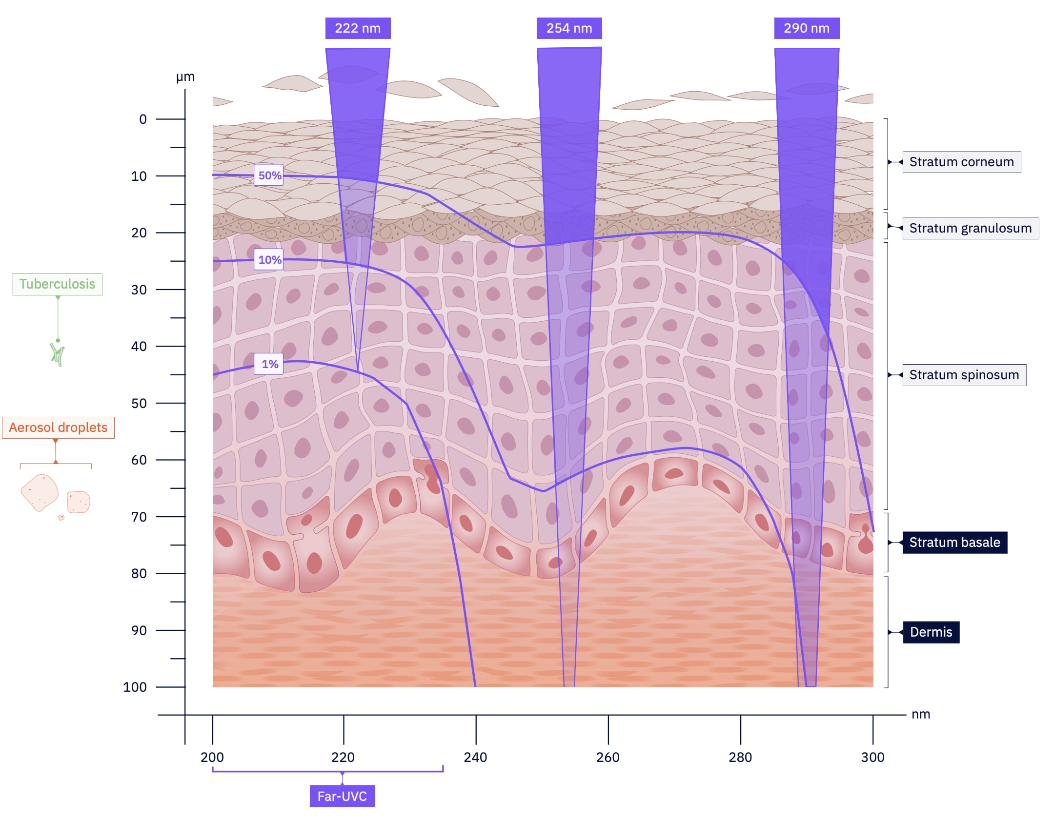 Far-UVC light, in contrast, has a much shorter wavelength. This shorter wavelength means it is strongly absorbed by biological materials, meaning its penetration is limited to the non-living outer layer of the skin and the very top of the eye’s surface. While safety studies are ongoing [1][2][3], this is why far-UVC is widely regarded as safe for use in the presence of people.