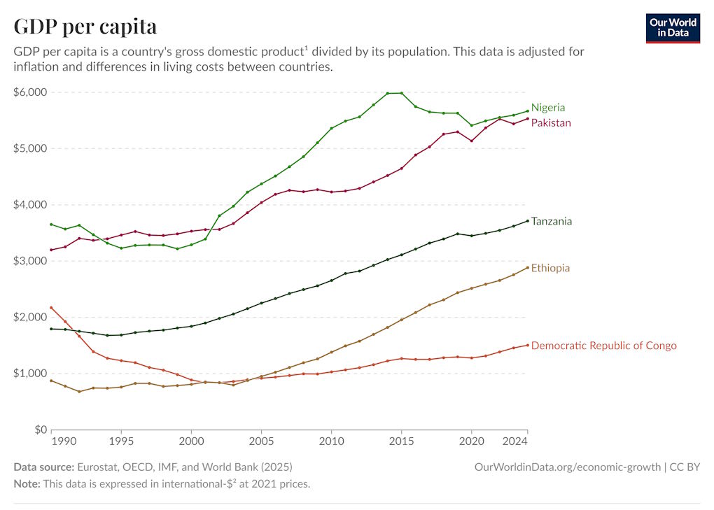 The result of this disparity is visible in the chart at the top of this post. By 2100, six out of the fifteen most populous countries in the world — and three of the top five — will be places that as of 2025 have under $7,000 in per capita GDP (PPP). The biggest ones will be Pakistan, Nigeria, and the Democratic Republic of the Congo, with Ethiopia and Tanzania not far behind. Altogether, over 2 billion people — a fifth or more of humanity’s peak population — is projected to live in those five countries.