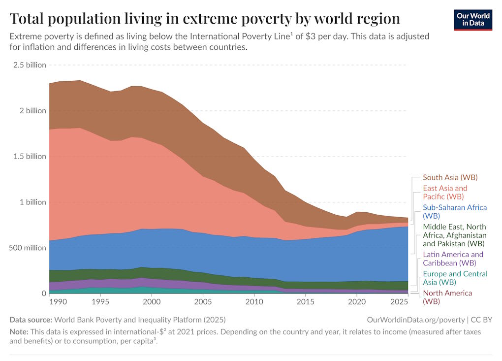 But as you can see on that chart, there’s a composition effect at work here — as big countries get rich, their fertility goes down, and their percentage of the human race falls as well. The countries with rapidly growing populations are those that failed to provide for their people. Now that Africa comprises a majority of the world’s extremely poor population, the drop in extreme poverty has stalled, and may soon start to rise again.