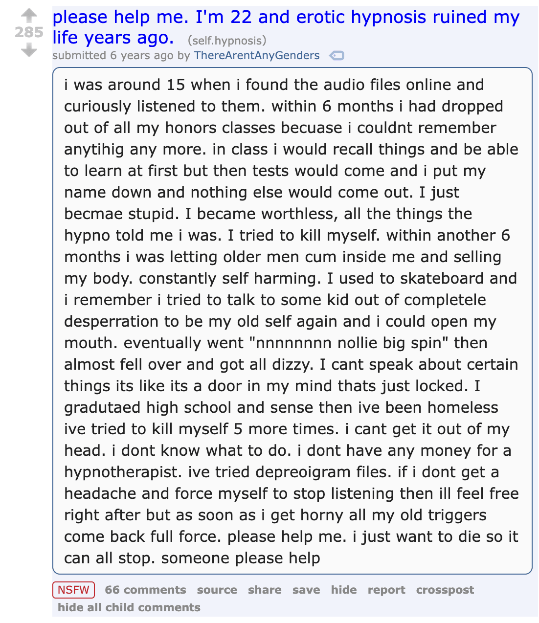 My sister used to suck her thumb, so I decided to hypnotize her and tell her that her thumb tasted like shit. The effect only lasted for about 45 minutes, but the moment I saw the horrified look on her face when she put her thumb in her mouth, I knew my days of hypnotizing people were over.