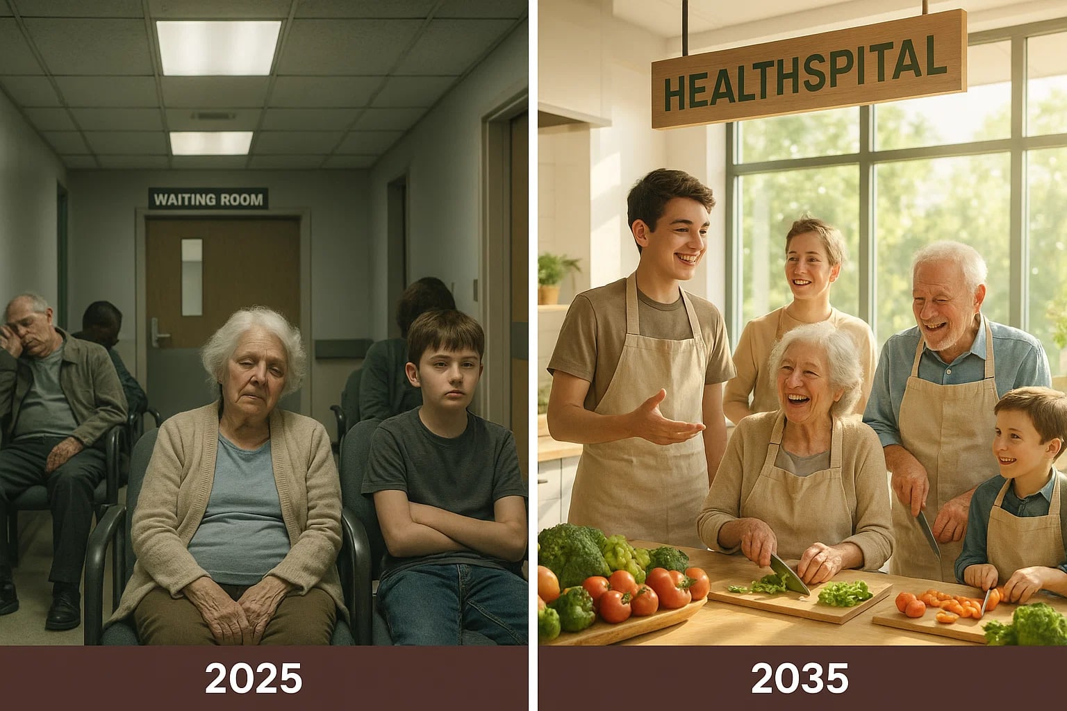 Before exploring our timeline, consider this vision: On the corners where CVS and Walgreens stood in 2025, many shuttering or on the verge of bankruptcy, by 2030 they are replaced with Healthspital Collectives, a whole new model of healthspan, lifestyle and community, becoming companions to the Heartland Marts replacing Dollar General. Health insurance is replaced with an entirely new ecosystem intertwined with health and food while healthcare as it is known in 2025 shrinks by 75% to just 5% of GDP (from the 20%) by 2035 and focuses soley on acute care and catastrophies. Chronic disease becomes a disease of the wealthy as the insurance model changes and benefits for lifestyle diseases become limited and only covered through plans accessible by the elite. Children grow up without pediatricians, instead meeting annually with lifestyle coaches who ask age-appropriate questions about what wellness means to them and plans of how to be healthy through day to day choices. By 18, lifestyle navigators create personalized healthspan plans for each individual and it includes a decade by decade vision with biometrics associated with each milestone objective. Employers fund these plans. Insurance changes and becomes an umbrella policy that integrates nutrient dense food, promeomics, healthp\lan and life insurance with what was once known as health insurance become limited and covering uncontrollable catastrophic events. Hospitals transform into community centers with only about 5% of their 2025 infrastructure footprints dedicated to actute care. Communities gather daily for meals and movement at the Healthspital Collectives and a new Healthchat platform is used to integrate all aspects of Healthspan. Health becomes about thriving, not surviving.