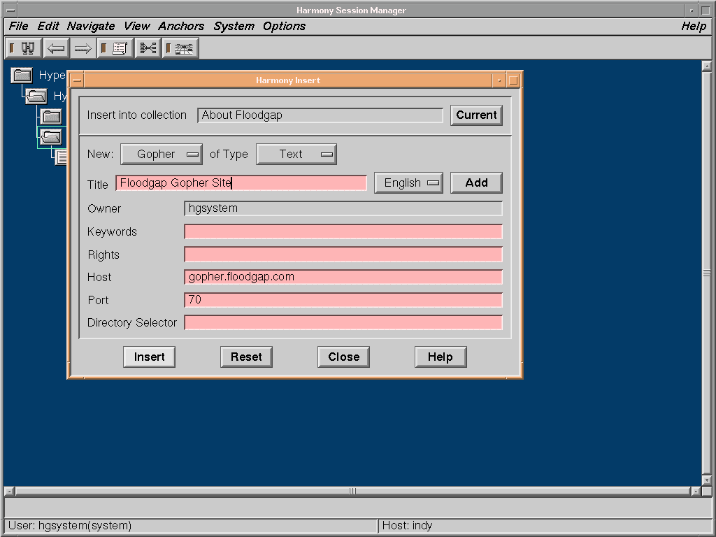 ... and the Floodgap gopher server. Because Hyper-G knows what these protocols are, they each get options appropriate to them (such as, with Gopher, the selector). Also, notice that both of these resources could be inserted with their own Rights attached.