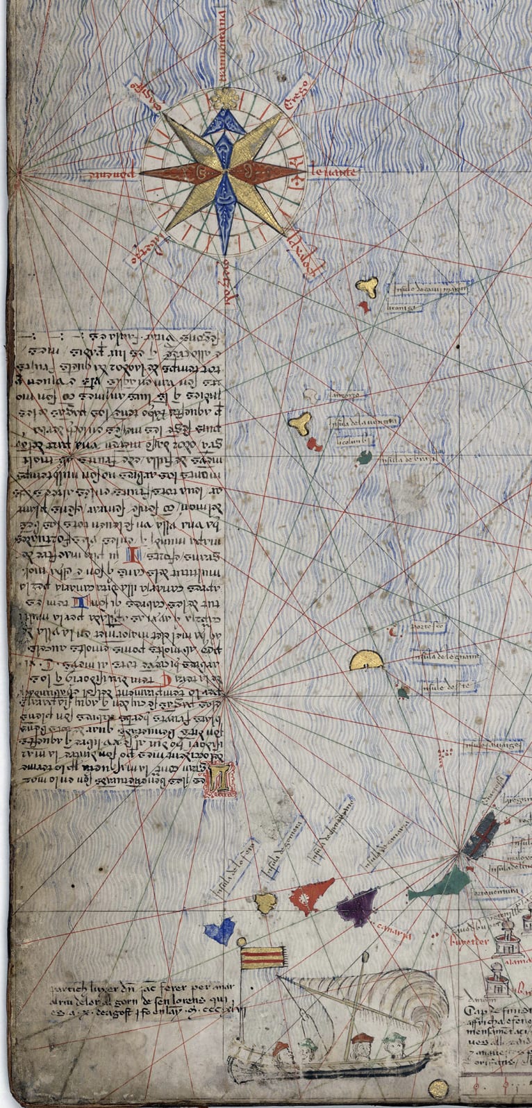 Out beyond Europe, Cresques gives us evidence that Europeans’ horizons are expanding. He shows us the Canary Islands off the coast of Africa, with an Aragonese sailing vessel setting out into the great ocean. And, significantly, he includes one of the first decorative compass roses, a useful ornament that would become an ornamental staple of maps: